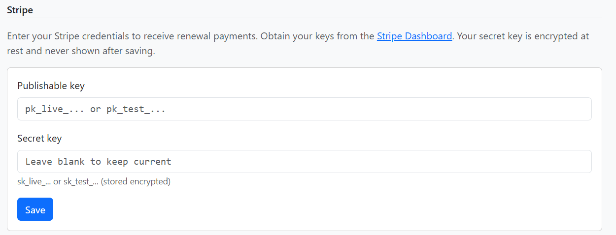 Stripe integration for receiving renewal payments. Obtain keys from the Stripe Dashboard. When configured, contacts can pay renewal fees via the link in reminder emails.