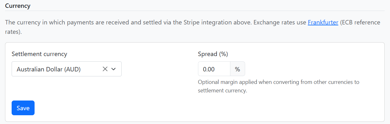 - Settlement currency – The currency in which payments are received and settled. Exchange rates use Frankfurter (ECB reference rates).