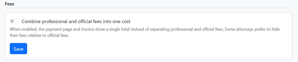 - Combine professional and official fees into one cost – When enabled, the payment page and invoice show a single total instead of separating professional and official fees. Some attorneys prefer to hide their fees relative to official fees.